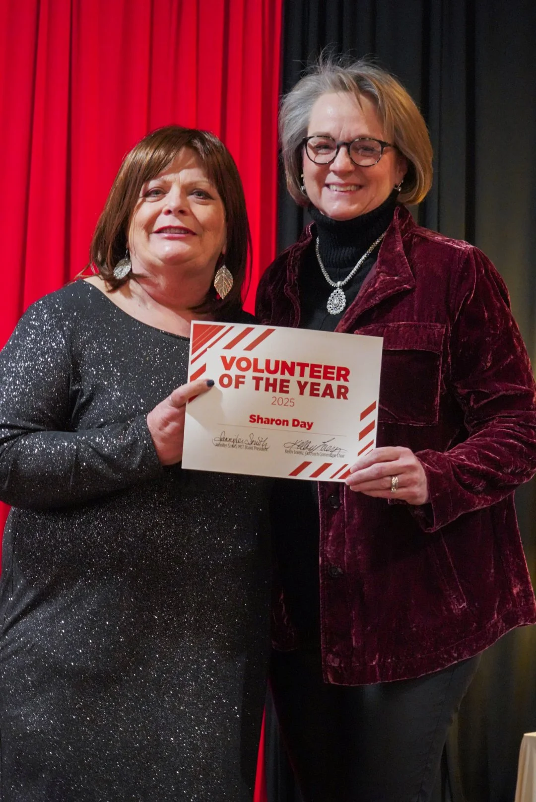For her willingness to jump in and help out with many projects, including sewing, hemming, and fixing numerous costumes in our 22nd Season. Photo featuring Toni Lorenz, Director of Development and Sharon’s longtime friend, who presented her award.